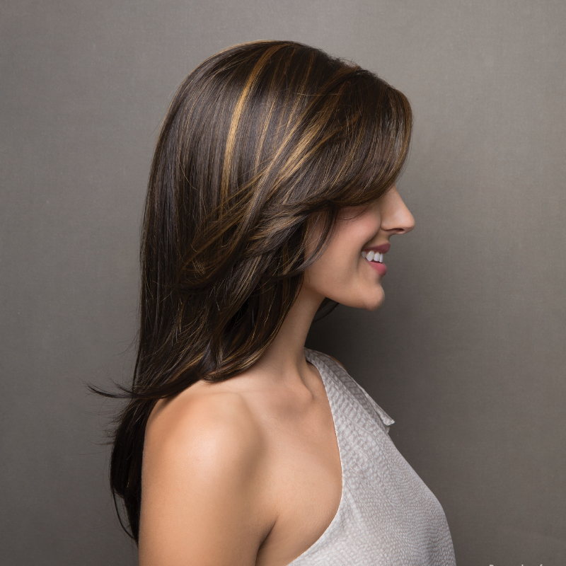 The Angelica wig by Noriko is a long style with textured layers that fall to mid-back in a full flowy style. Part Monofilament top