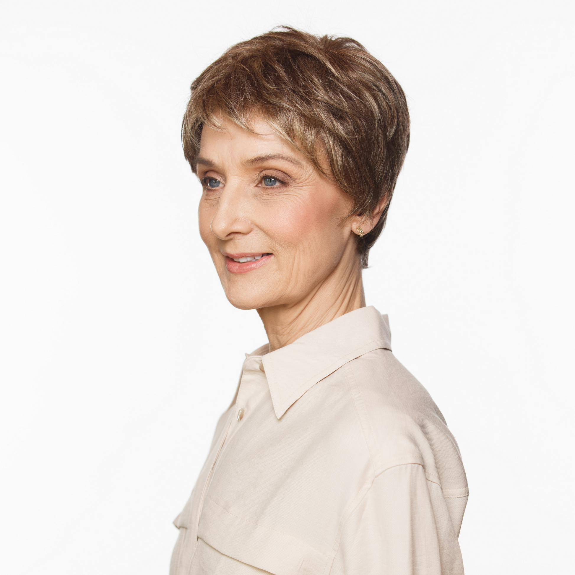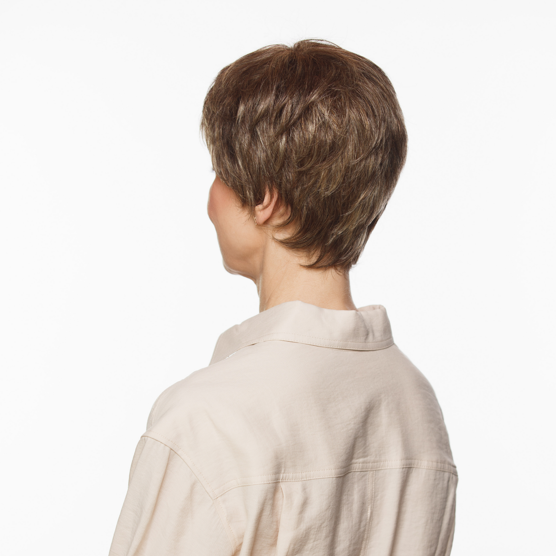The Dahlia wig by Sentoo is a modern short style that tapers beautifully in to the nape for a soft and natural look. The soft feathery fringe can be worn forward or brushed back off the face for a different look.