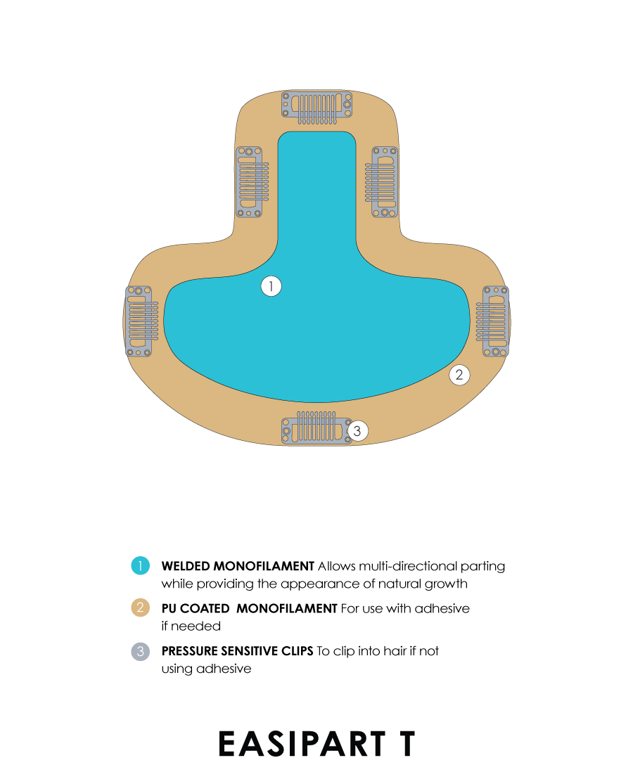 EasiPart T is ideal for those experiencing beginning to mid/progressive hair loss and looking for more coverage and volume in the crown area. This topper features more density, a wider base for more all-over coverage, and larger polyurethane perimeter with five strategically placed pressure sensitive clips that can be removed if Tape ‘N Go or adhesive is applied. Available in 12- and 18-inch lengths.