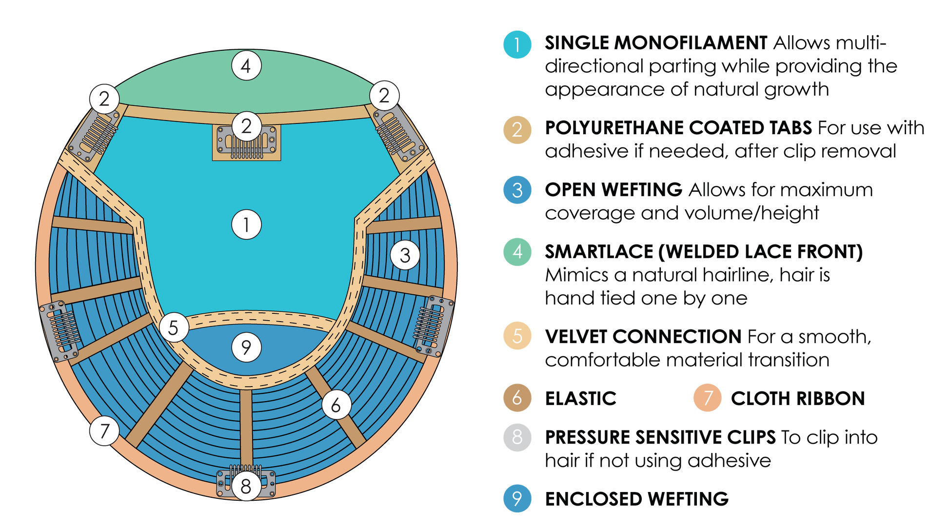 With 6 strategically placed clips, the 9-inch base clips in comfortably and securely. Designed for the advanced stage of hair loss, this lace front topper also features 3 polyurethane tabs to facilitate the use of adhesive if needed. Available in 12" and 18" lengths